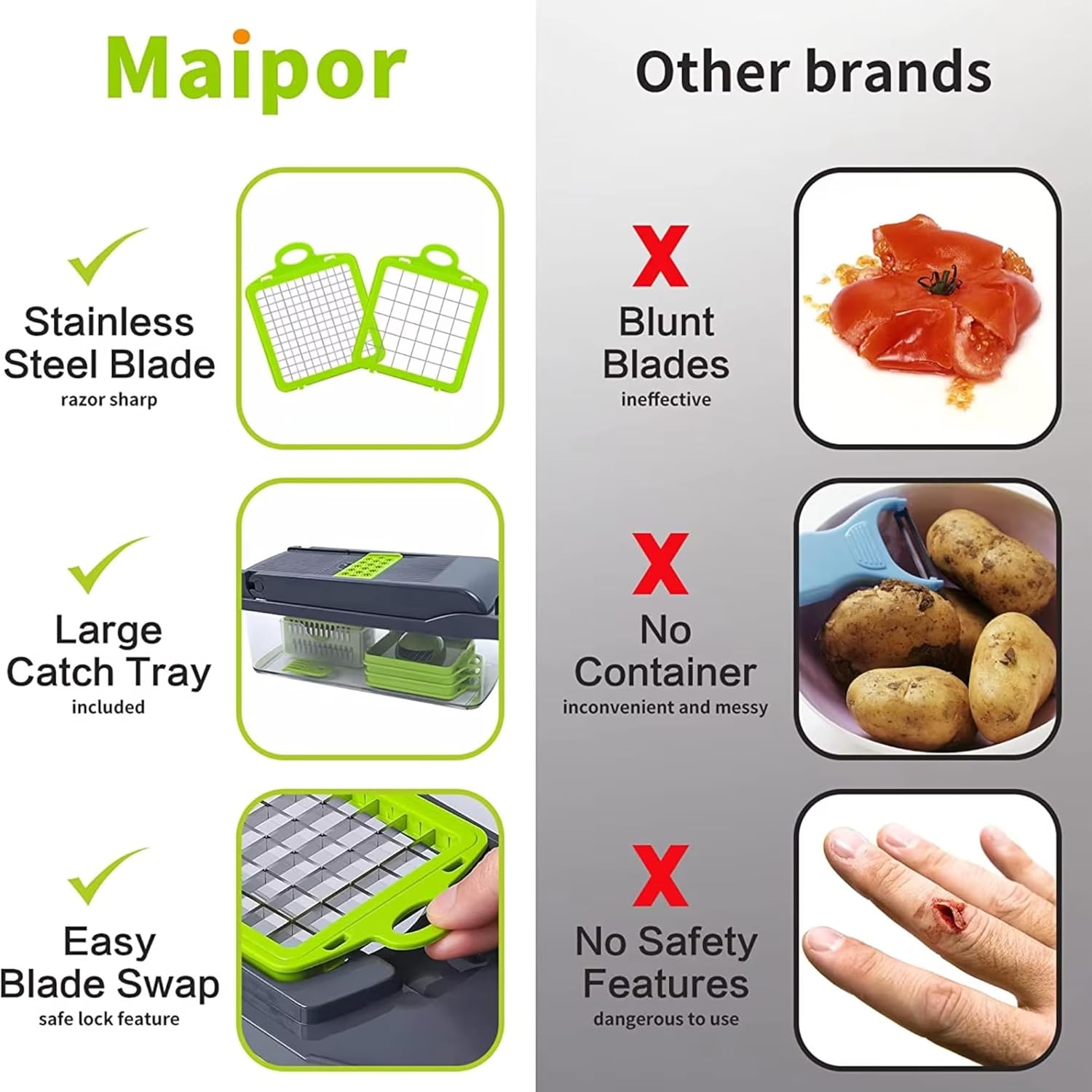 - 🍅 15-in-1 Multifunctional Design: Slice, dice, chop, grate, julienne, and spiral – all with one compact vegetable chopper. Includes 8 interchangeable stainless steel blades for every kitchen task.