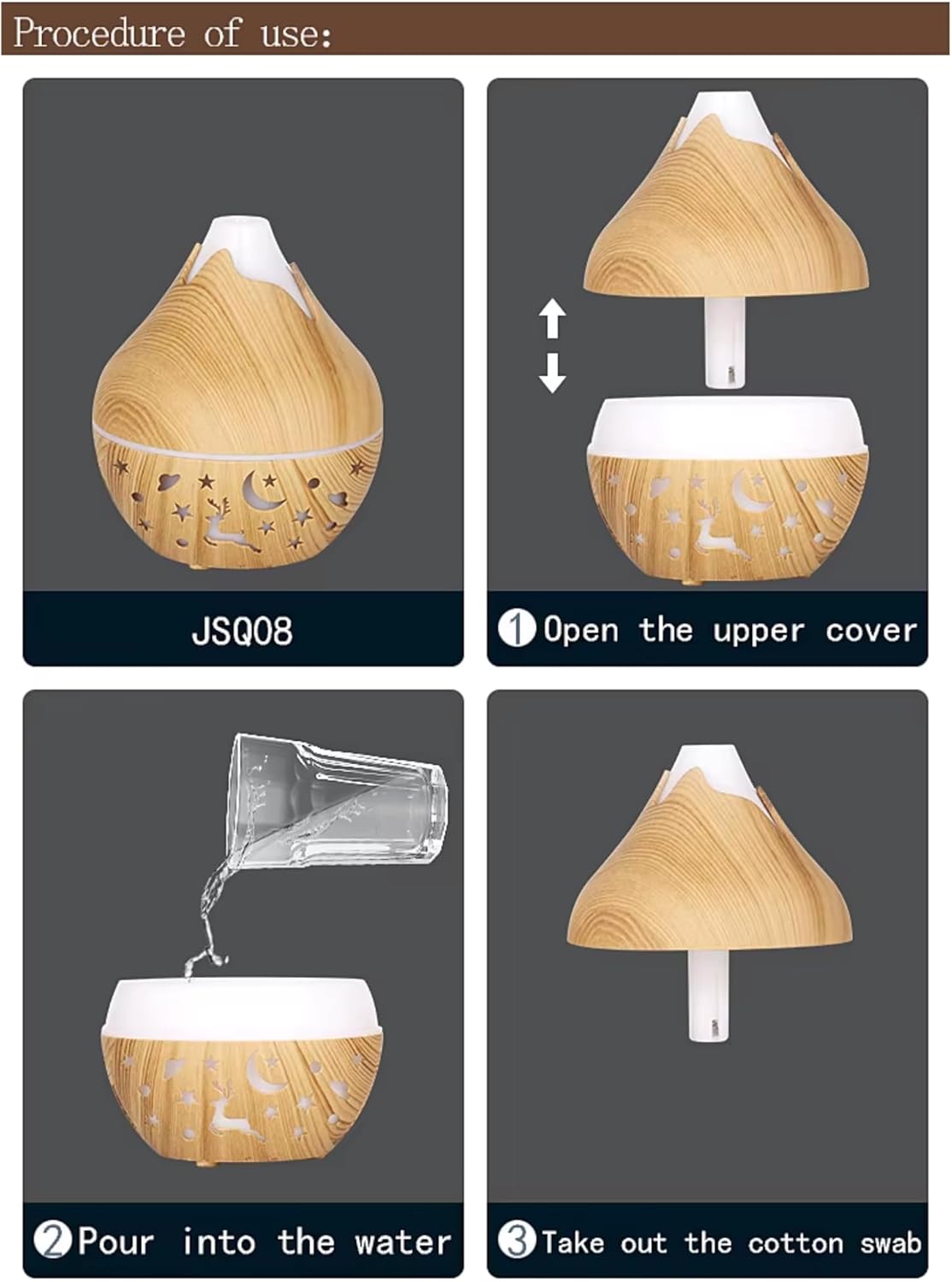- 🧘 Compact, Stylish & Easy to Use – 350ml capacity lasts up to 10 hours. Sleek wood-grain design complements any décor. One-touch buttons for mist and light control.