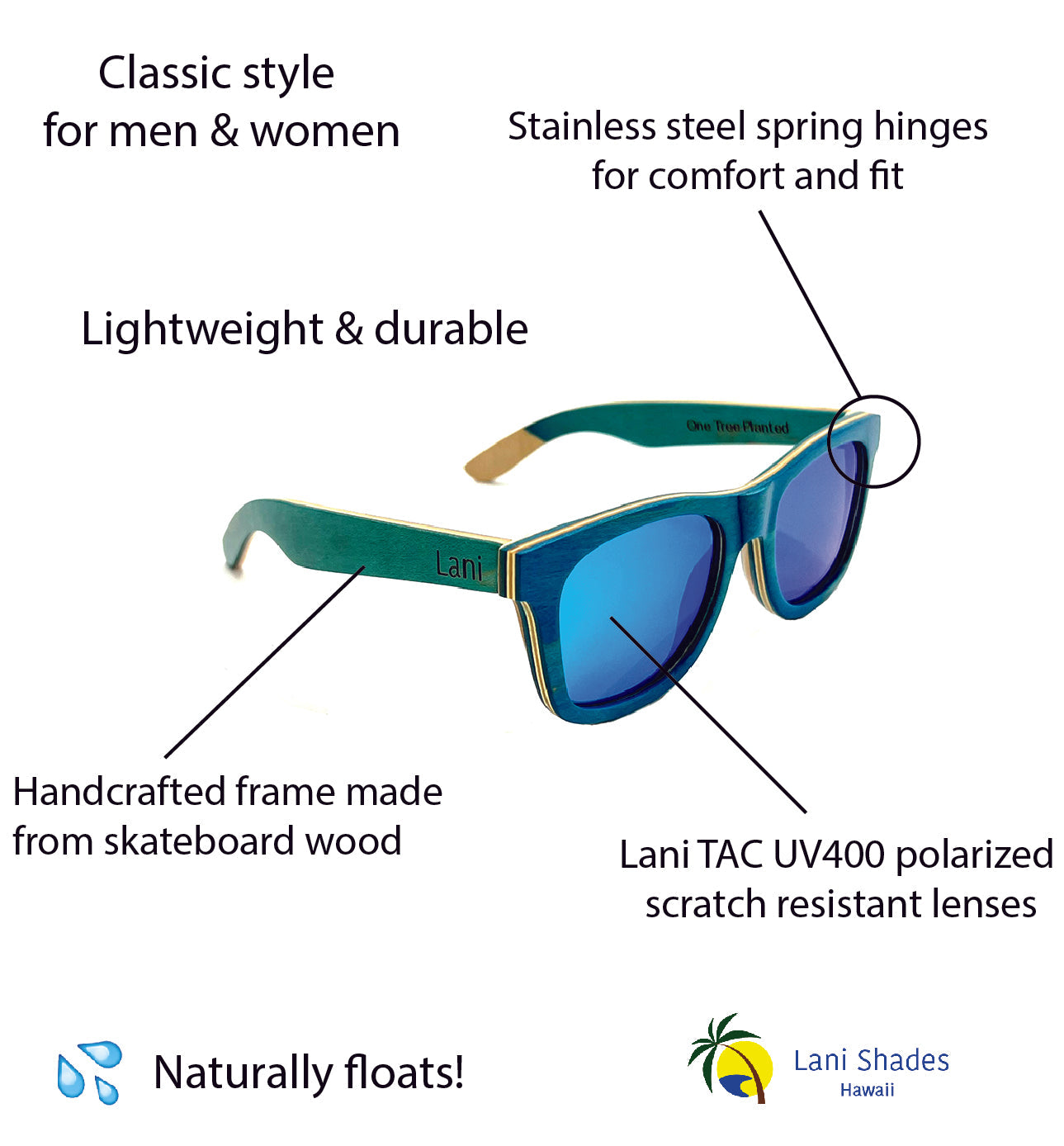 Designed by sailors in Hawaii in the search for the perfect sunglasses to have on the water. Lani Shades bamboo and wood sunglasses frames float and if they float away, that's less plastic on the beach. Each pair sold plants a tree through our partnership with One Tree Planted.