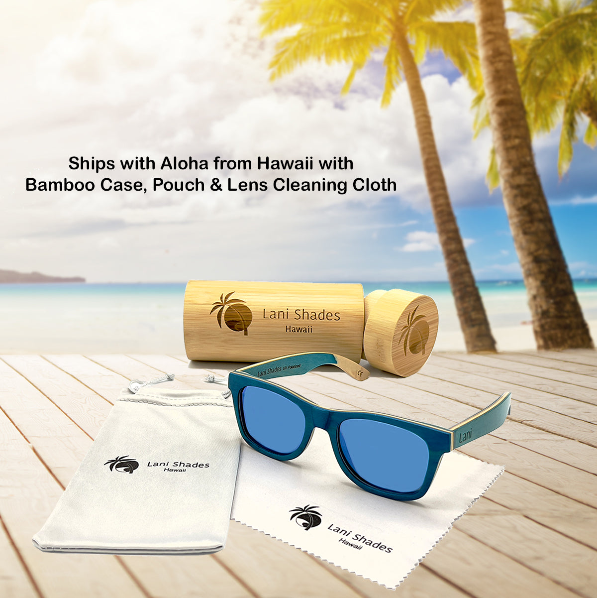 The Lanikai Nalu comes with ocean blue mirrored lenses. All Lani Shades bamboo and wood sunglasses feature UV400 Polarized Lani TAC scratch resistant lenses - highest quality lenses in expertly handcrafted bamboo wood frames that are comfortable, lightweight and durable. All Lani Shades sunglasses are equipped with stainless steel spring hinges for comfort and fit. Each also comes with a sturdy bamboo tube case, microfiber cleaning cloth, pouch and worry free guarantee.