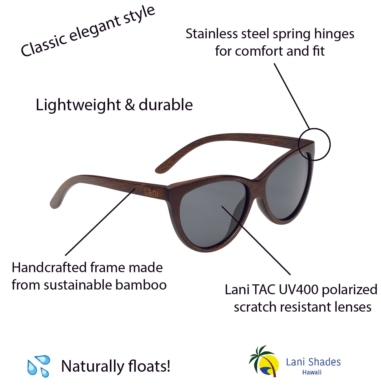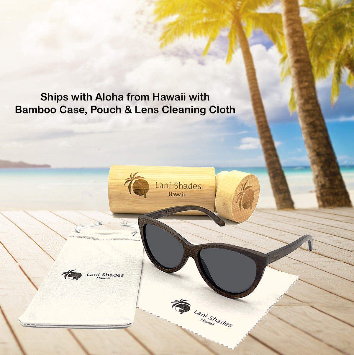All Lani Shades bamboo and wood sunglasses feature UV400 Polarized Lani TAC scratch resistant lenses - highest quality lenses in expertly handcrafted bamboo wood frames that are comfortable, lightweight and durable. All Lani Shades sunglasses are equipped with stainless steel spring hinges for comfort and fit. Each also comes with a sturdy bamboo tube case, microfiber cleaning cloth, pouch and worry free guarantee.
